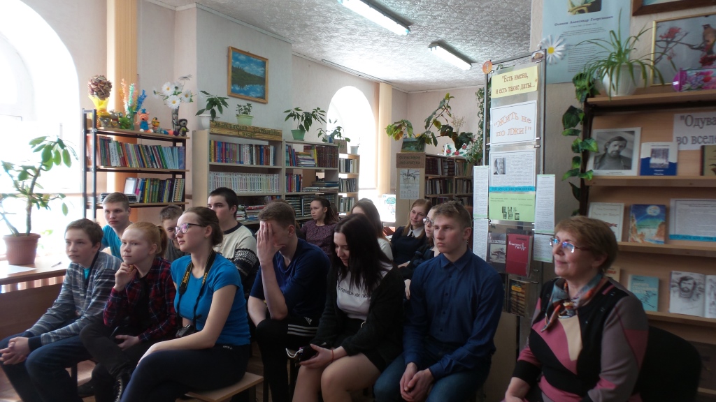 На часе патриотической литературы «Кто за Родину горой, тот истинный герой» школьники вспоминали произведения о войне А. Твардовского «Василий Теркин», Н. Бирюкова «Чайка», Б. Васильева «А зори здесь тихие…» и другие, отвечали на вопросы, читали отрывки из произведений. Краеведческая игра-викторина «Север – наш любимый край» показала, насколько хорошо старшеклассники знакомы с историей и культурой коми народа.