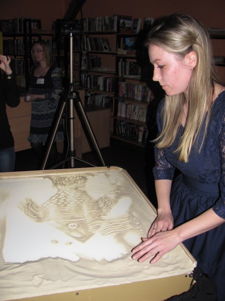 "Во сне и наяву" – открытие персональной выставки с таким названием молодого художника – Елены Казаковой продолжило программу вечера. Песочная анимация, в исполнении талантливой девушки, буквально заворожила зрителей. Зал, затаив дыхание, следил, как под руками художника обычный песок превращался в рукотворную сказку. Елена рассказала о себе, своих работах, поделилась секретами мастерства, ответила на вопросы.