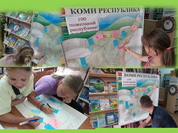 Читатели Визябожской библиотеки приняли участие в уличной акции «100 пожеланий для республики». Каждый мог написать любимому краю свои самые искренние пожелания. На краеведческом часе «Люби и знай свой коми край» ребята узнали о Семи чудесах Республики Коми, вспоминали города и районы, совершили виртуальное путешествие в растительный и животный миру играли в коми народные игры.
