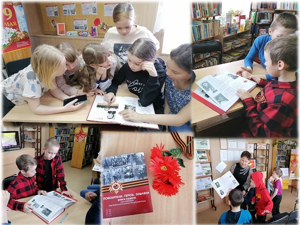 В центральной библиотеке им. М.Н. Лебедева и детской библиотеке для детей и взрослых проведены меропряития, посвященные Дню Победы. Ребята узнали пррисхождение георгиевской ленотчки, о том как правильно ее носить. На мастер-классе смастерили значок с георгиевской ленточкой. Волонтеры Победы Корткеросской библиотеки провели квест для третьеклассников "Дорогами Победы". На станциях ребята складывали фронтовые письма, делали перевязки раненному, пели военные песни, дешифровывали важное послание, учились определять вражескую технику. изголодавшиеся дети находили приют и свое призвание в рядах советской армии. О судьбе детей участников войны познакомились ребята 7 класса Аджеромской средней школы в видеопрезентации «Маленькие герои большой войны». Также ребята нашли в книгах и интернете стихотворения, посвященные юным героям Великой Отечественной войны.