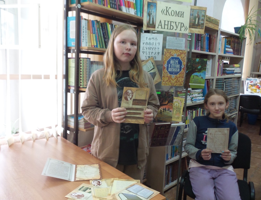 В центральной библиотеке имени М.Н. Лебедева девятиклассники еще раз вспомнили основателя коми письменности Стефана Пермского, познакомились с развитием коми письменности за прошедшие столетия - от стефановского анбура и молодцовского алфавита 30-х годов прошлого века до современного коми языка.