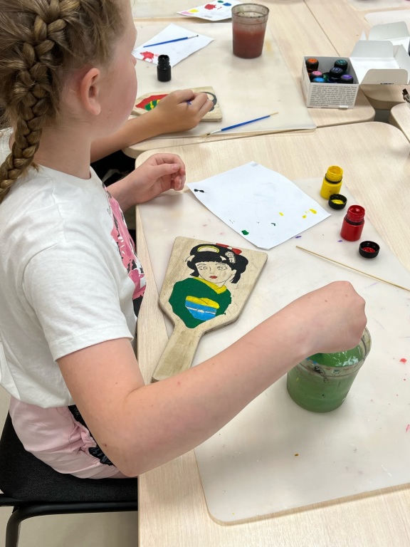На площадке ребята знакомились с культурой, традициями и обычаями Япониии и Китая. Кто такие самураи и гейши, как носят кимоно, как выглядит японский театр кабуки, как поприветствовать собеседника на японском языке - об этом и многом другом узнали юные читатели. На занятиях ребята научились игре с верёвочкой "Аятори". Завязывая веревку определенным образом, можно получить разнообразные фигуры - чашку, стрелу, паука, мост и другие. Игра развивает моторику, память и воображение. Узнали, как играть в карточную игру "Кой кой" с японской колодой "ханафуда". Одно из занятий было посвящено японскому бадминтону "Ханэцуки". Точнее его атрибуту - ракетке "хагоите", которую японцы расписывают и дарят в качестве сувенира. На хагоите была нарисована майко - юная гейша. В завершающий день площадки кратковременного пребывания «Путешествие на Восток» ребята закрепили свои знания в японском языке для начинающих: повторили приветствия, числительные и простые фразы.