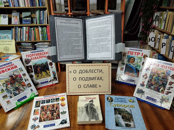 В Приозёрном филиале прошла тематическая беседа «Герои Отечества». Ребята познакомились с историей праздника, узнали имена славных русских полководцев, внесших неизгладимый след в историю России. К мероприятию была оформлена информационная выставка «О доблестях, о подвигах, о славе».