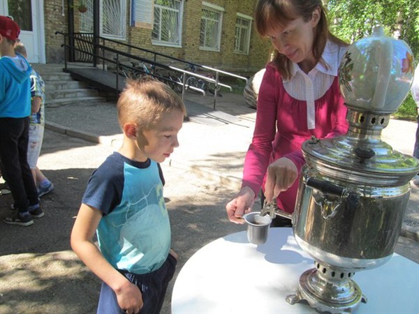Последний день площадки был посвящен чаю и самоварам. Ребята отправились в интерактивное путешествие и узнали все о чае: где его начали выращивать, как он попал в Россию, о чайной церемонии в Англии и Японии; читали книгу М.Горького "Жил-был самовар". А вкусный чай из настоящего угольного самовара да еще с плюшками стал подарком для всех мальчишек и девчонок, посещавших детскую площадку.