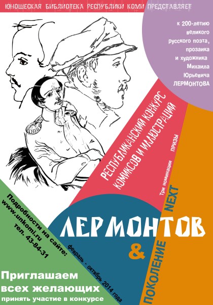 В 2014 году русскому поэту и прозаику Михаилу Юрьевичу Лермонтову исполняется 200 лет. Но сегодня художественные произведения гения русской литературы не теряют своей актуальности и привлекают всё больше почитателей по всему миру, находят новые необычные формы и проявления. Одним из современных жанров, набирающих популярность, является комикс. В рамках конкурса «Лермонтов и поколение next» (далее – конкурс), проводимого Юношеской библиотекой РК с февраля по октябрь 2014 года, будет осуществлена попытка соединить жизнь и творчество Лермонтова, ставшие золотым фондом российской культуры, с формой комикса, чтобы сделать его привлекательным и интересным для юного поколения читателей и привлечь их к знакомству с художественными произведениями Михаила Юрьевича.